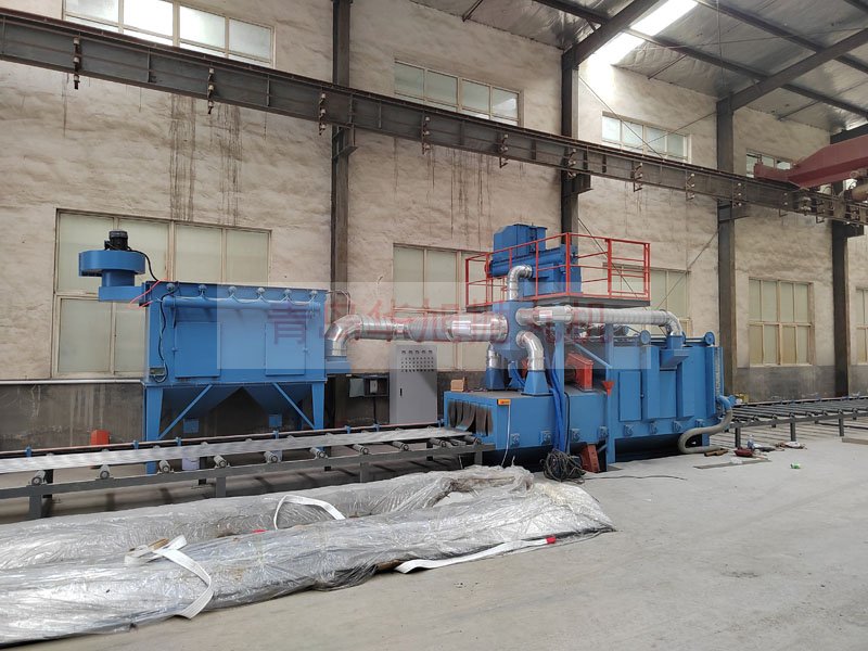 通過(guò)式鋼板拋丸機(jī),鋼板表面清理除銹現(xiàn)場(chǎng)